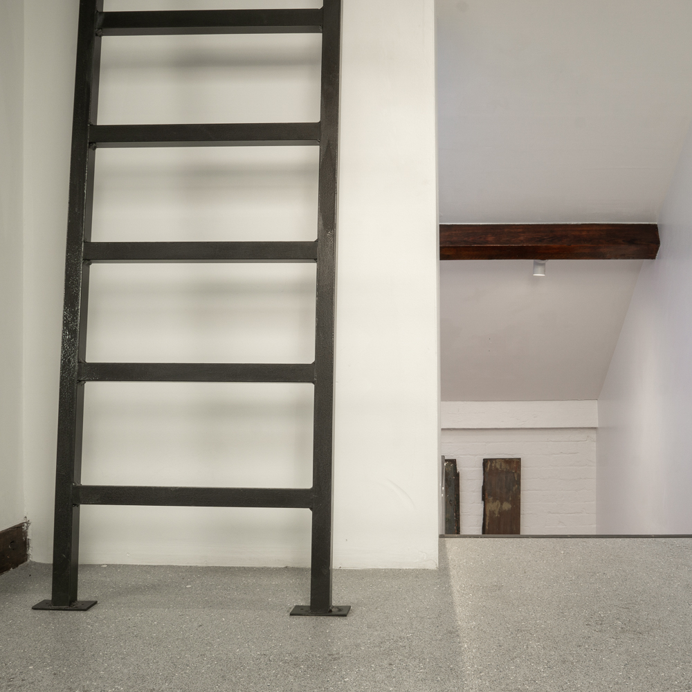 Mild steel desk with blackened cork top. Mild steel shelving unit with varnished cork shelves.