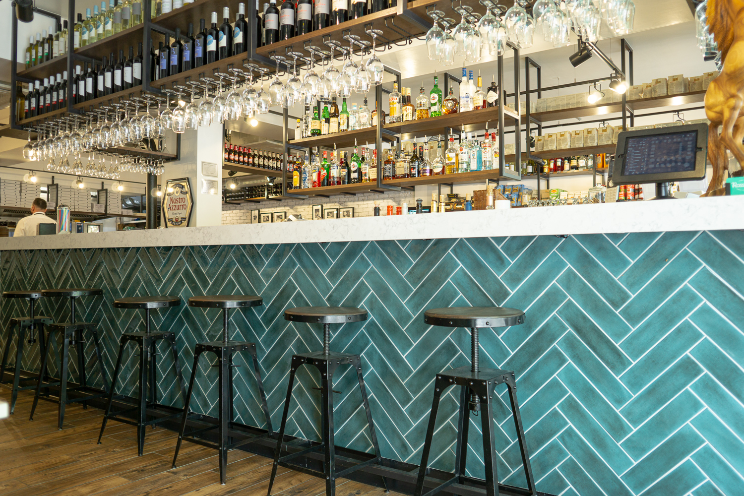 Formica Aria worktops with drop edge. Bar frame, skirting and kick rail all powder coated mild steel. Gantries with stained oak shelves. Bar stool tops.